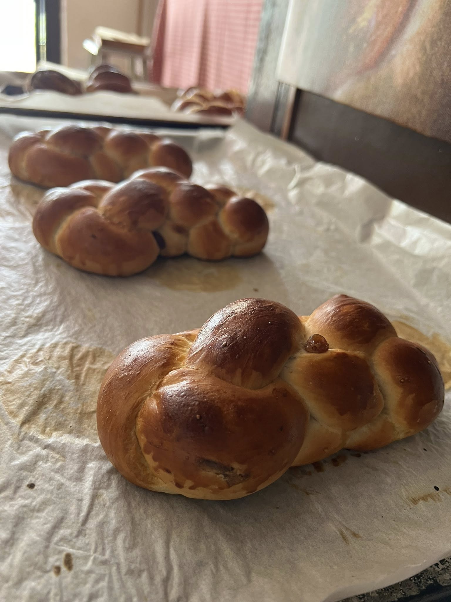 Toasted house baked bread with greens, Italian pasta salad, sausage, egg and yogurt