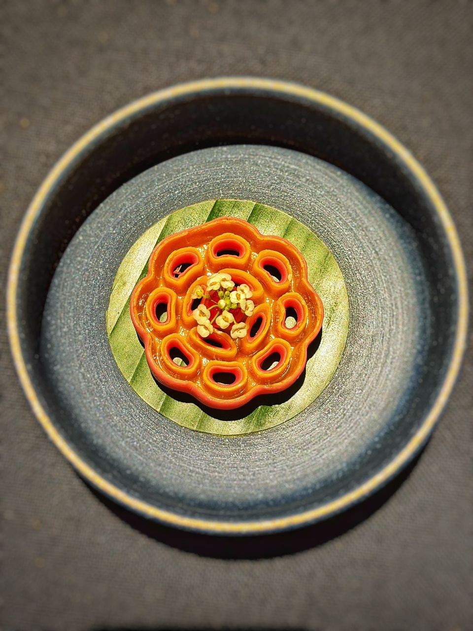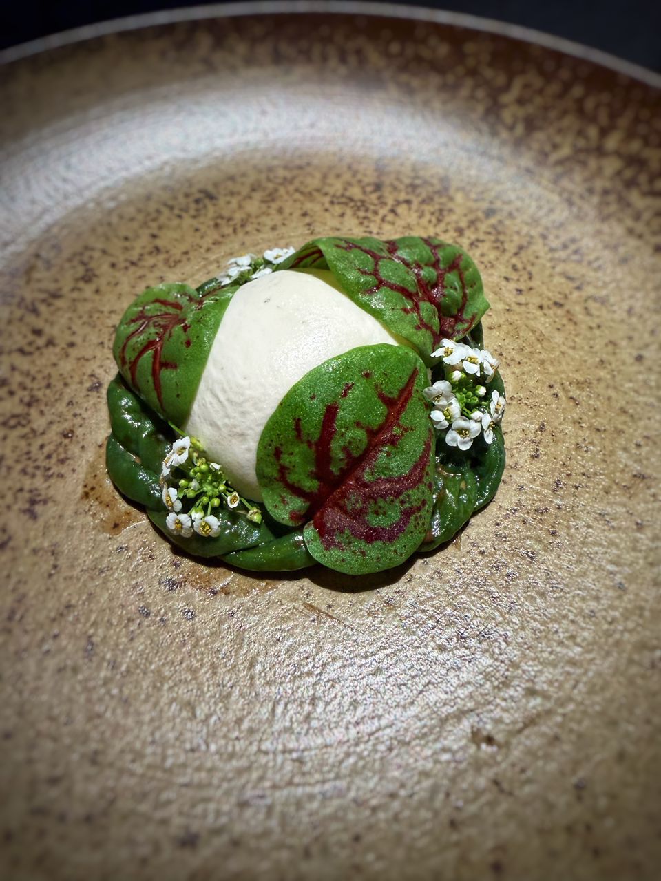 20.00% yeast bread. A bread made with tapioca and served with a Fermented Black Beans and Red Chill Emulsion sauce. Ibrahim, our host for the night, said that it was inspired by how people used to tapioca to make bread during the Wold War 2 when flour was not available. I am old enough to remember my mother talking about this time so I wonder how she would feel about me paying so much now to eat a tapioca bread.