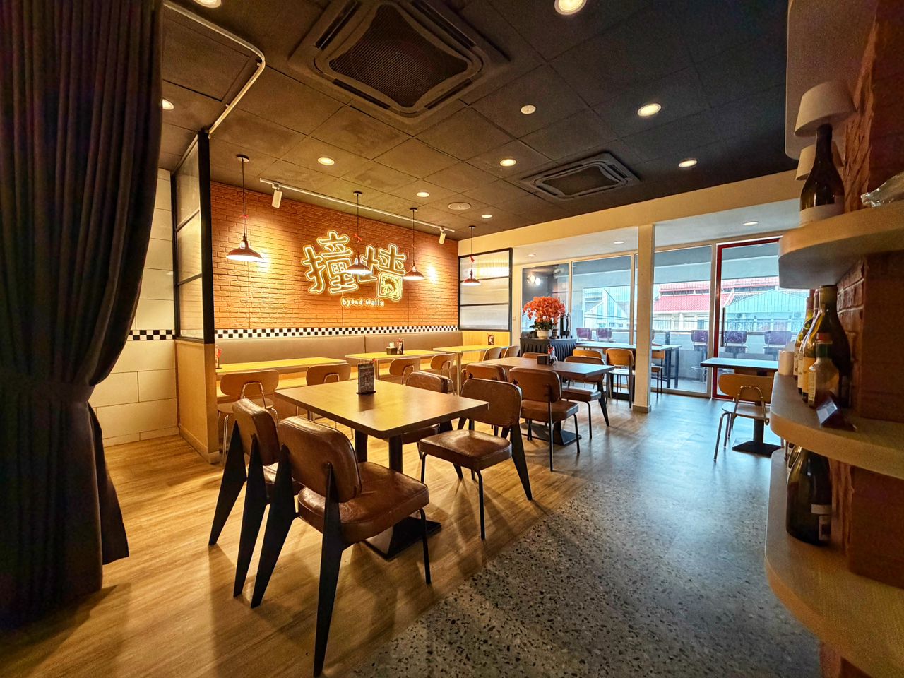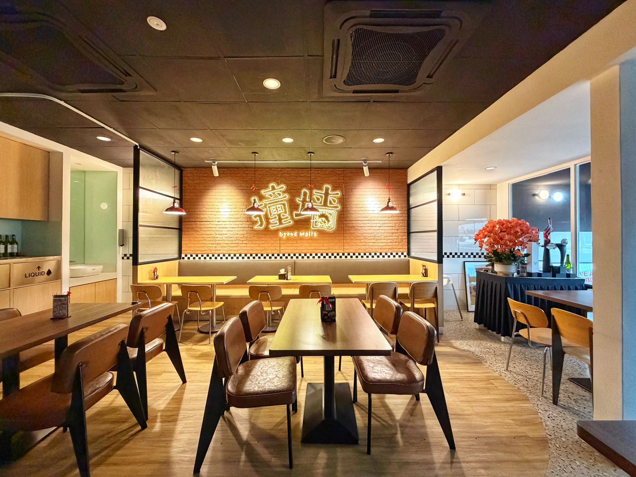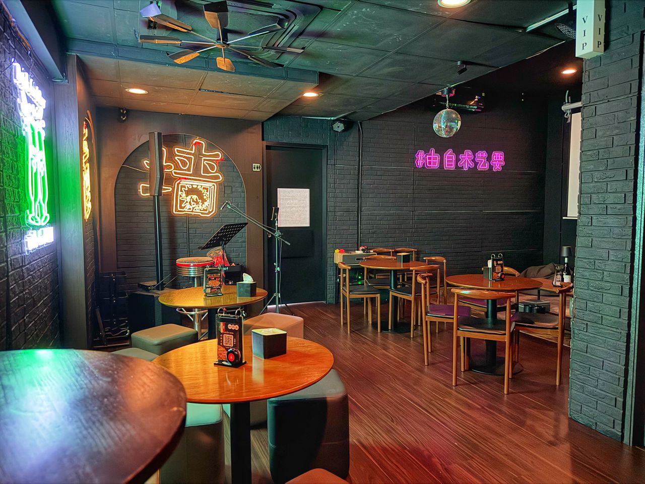 This inner area is a premier choice for organizers requiring audio visual equipment, as it comes fully equipped with a projector, screen, and dedicated audio equipment, making it suitable for presentations, karaoke sessions, or milestone celebrations. The aesthetic is modern and industrial, with exposed brickwork and warm neon accents that create a cozy yet sophisticated atmosphere for corporate gatherings or private parties.