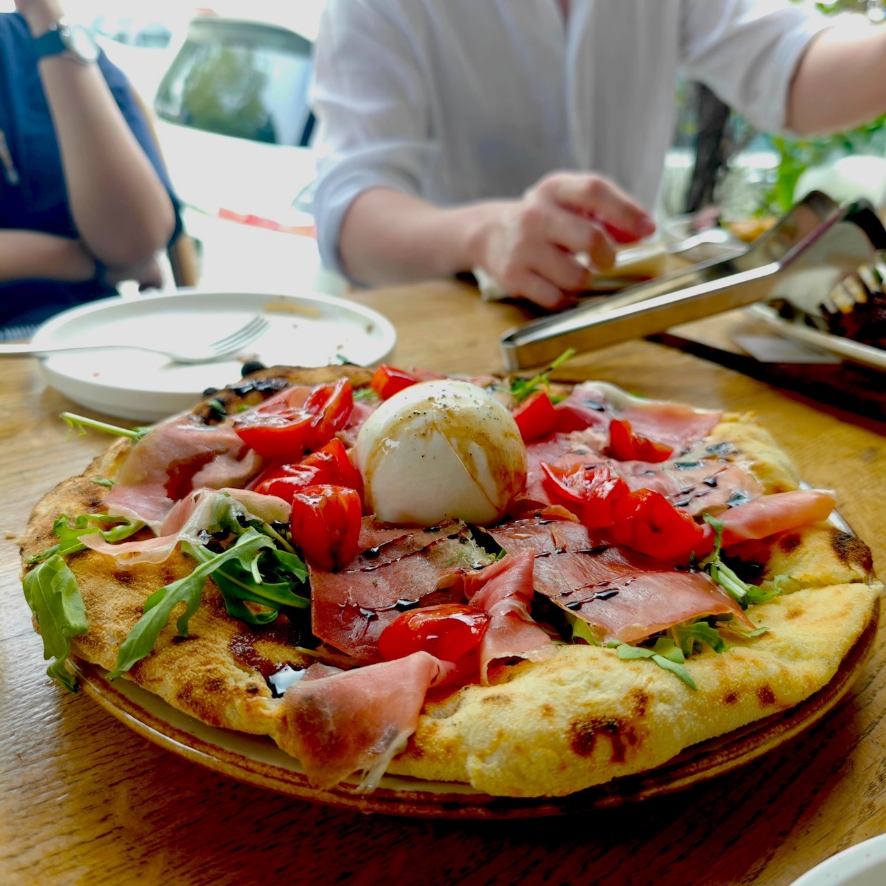 Pizza Bella Napoli Pizza with a whole burratina and Prosciutto di Parma as toppings