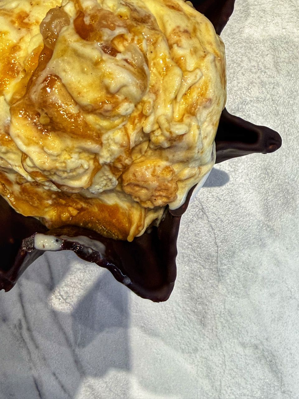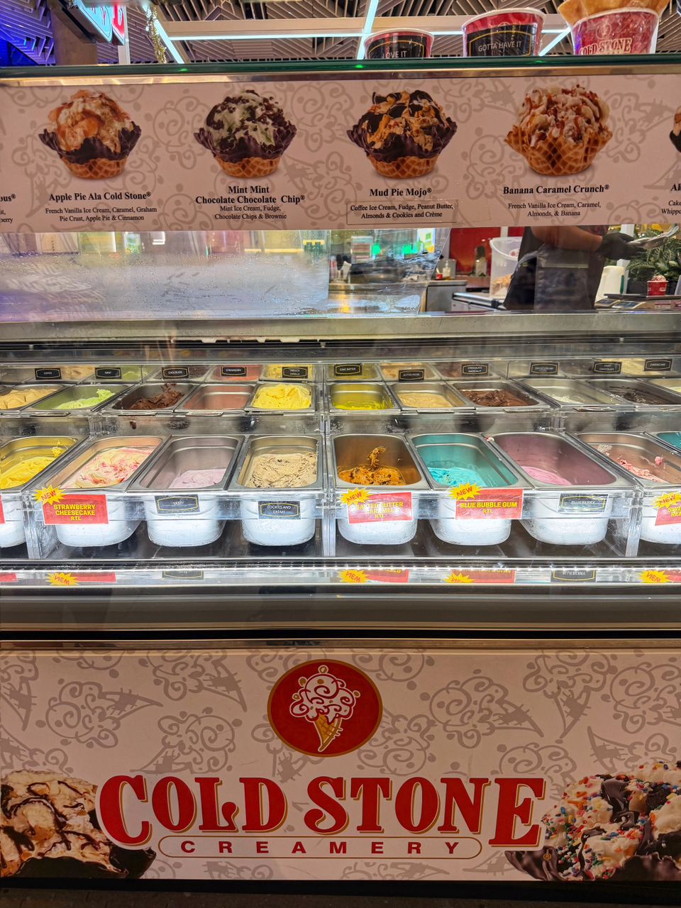 I ordered the Apple Pie Ala Cold Stone (8 oz) served in a chocolate-coated waffle bowl. The presentation is still as signature as ever, with the ice cream piled high in its dark chocolate shell. The texture is dense and rich, typical of their "super-premium" style which uses a high butterfat content to achieve that heavy, creamy mouthfeel.