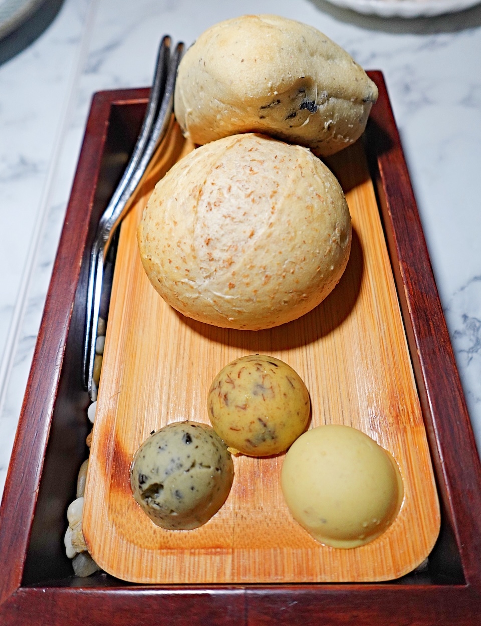 Started off with French dinner rolls (𝘱𝘦𝘵𝘪𝘵 𝘱𝘢𝘪𝘯𝘴) with 3 types of flavored butter: truffles, scallion oil and foie gras.