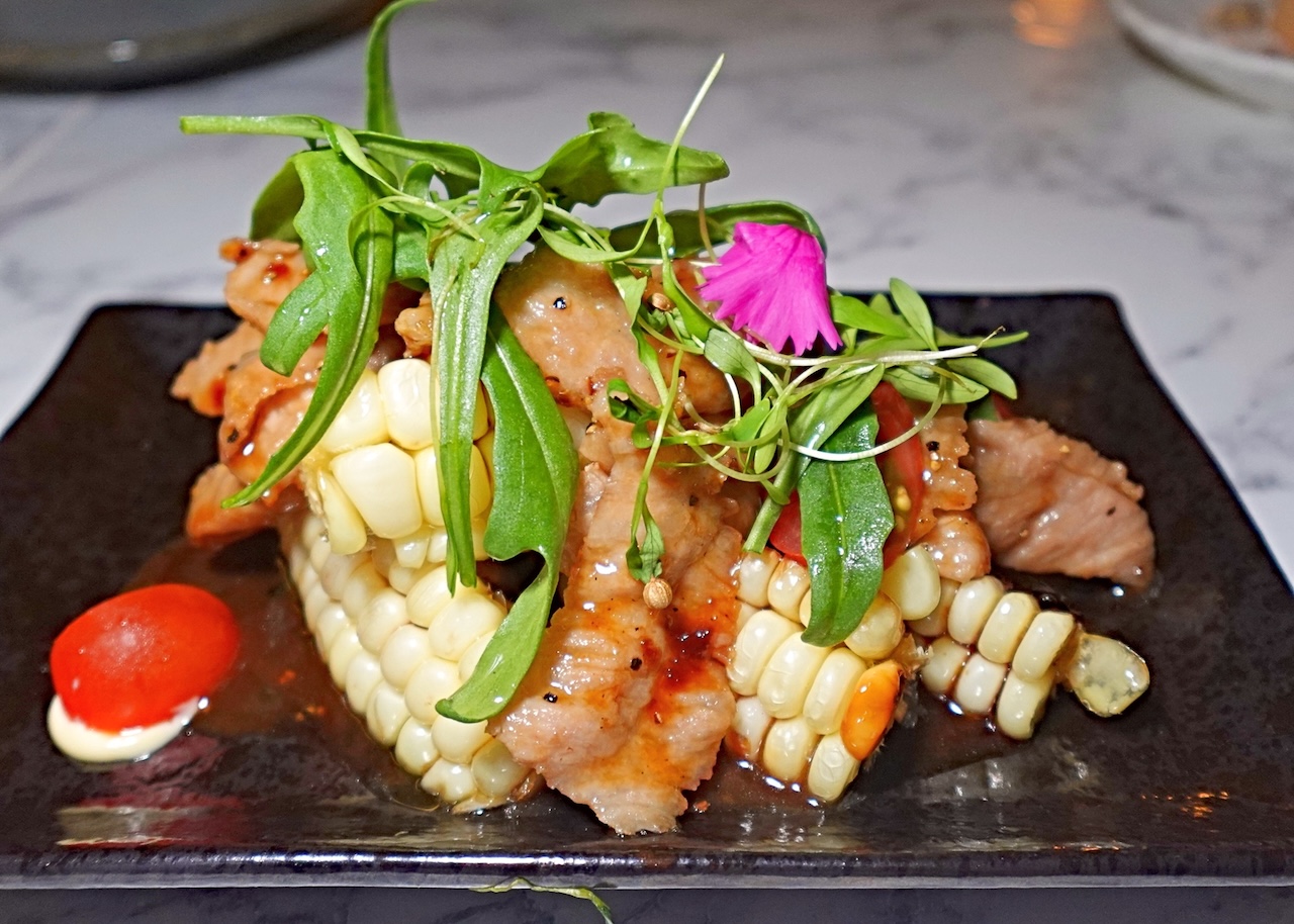 Grilled pork cheeks with corn ribs.