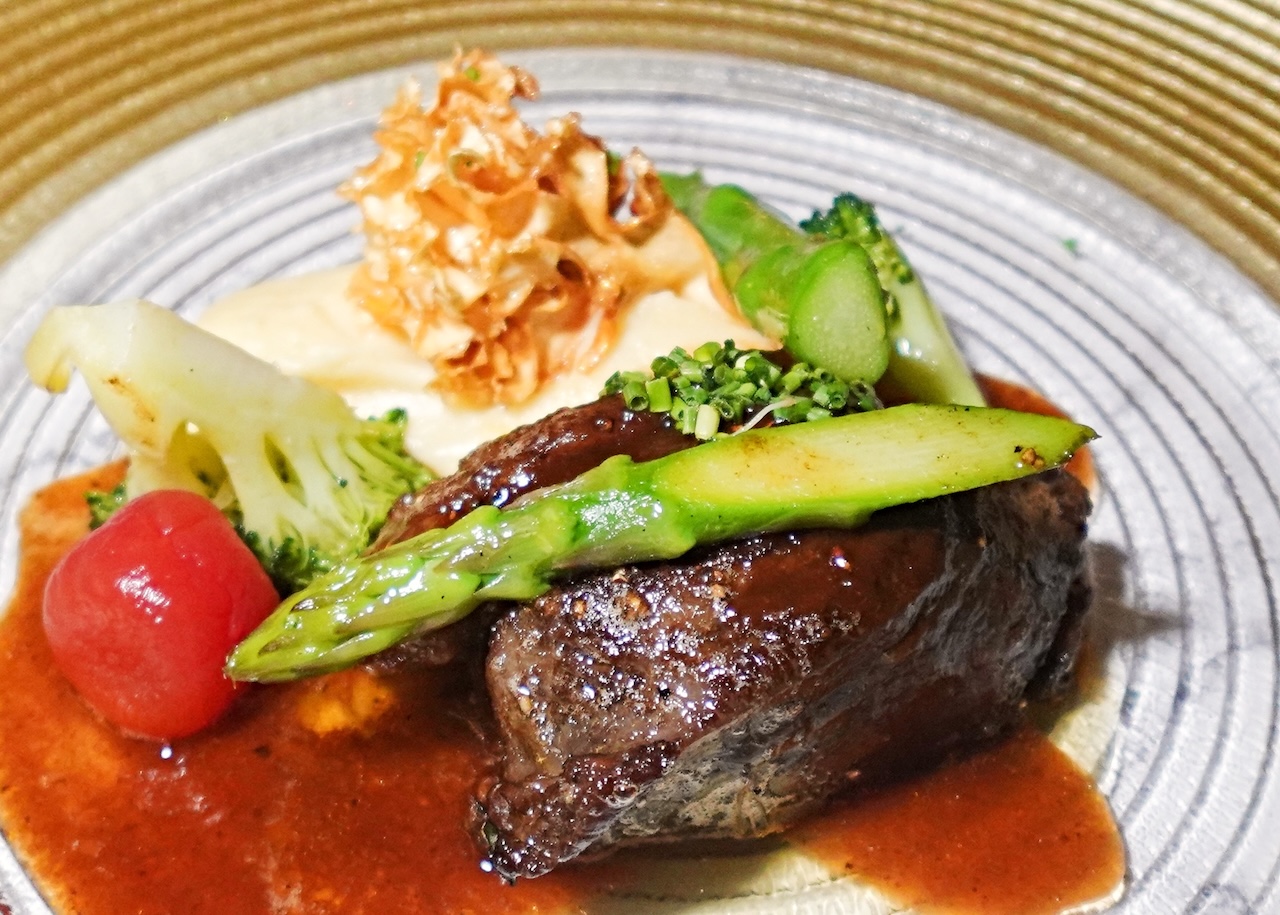 Slow-cooked Australian beef cheek, served with crisp-fried cauliflower mushroom, mashed potatoes, asparagus spear, broccoli and cherry tomato.
