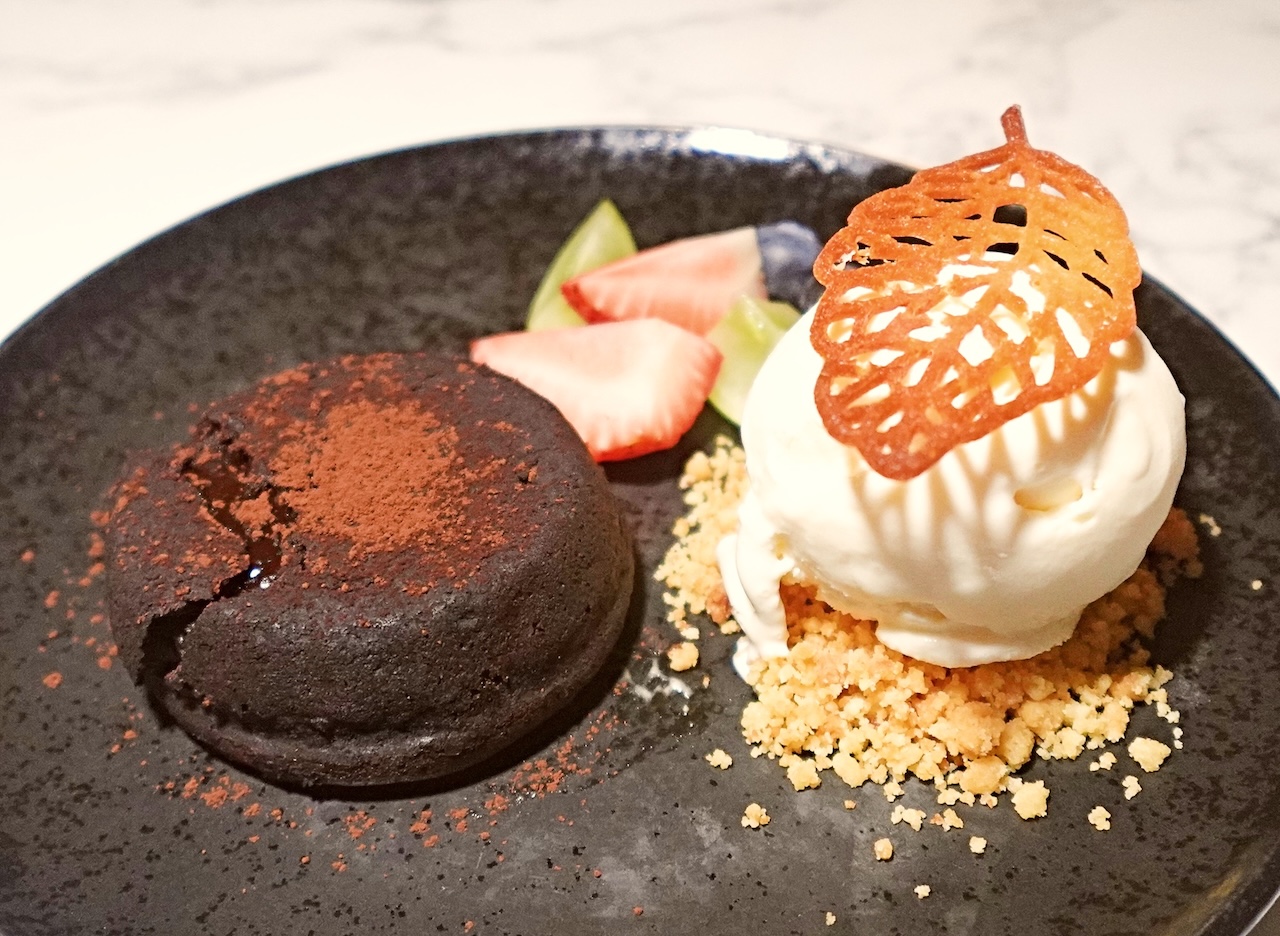 Valrhona chocolate lava cake a la mode, with mixed berries.