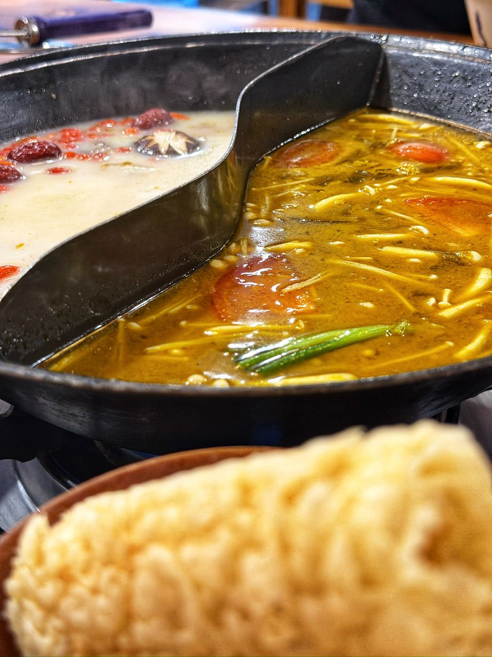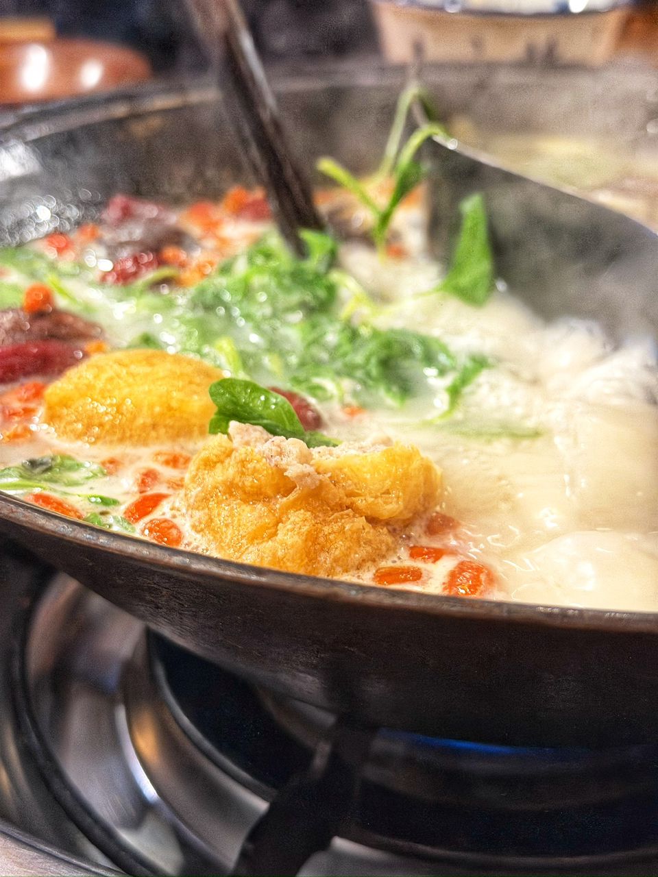 Both broths paired beautifully with the ingredients. The pork bone broth was soothing and delicate, while the suan chai broth had a tangy, savoury depth that made it hard to stop ladling more.