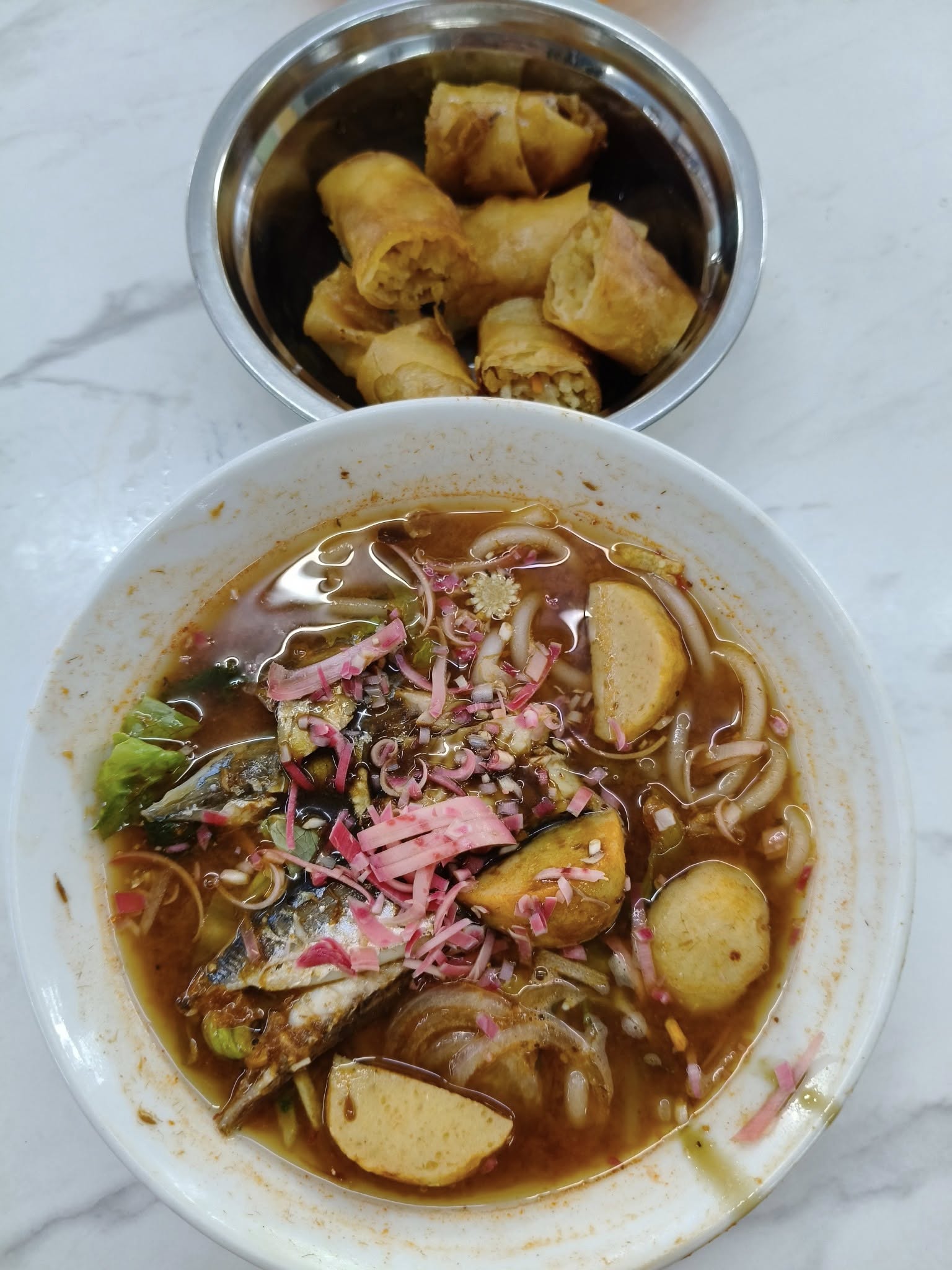 In Penang you dip the spring roll into the Asam Laksa for combination that is heavenly.