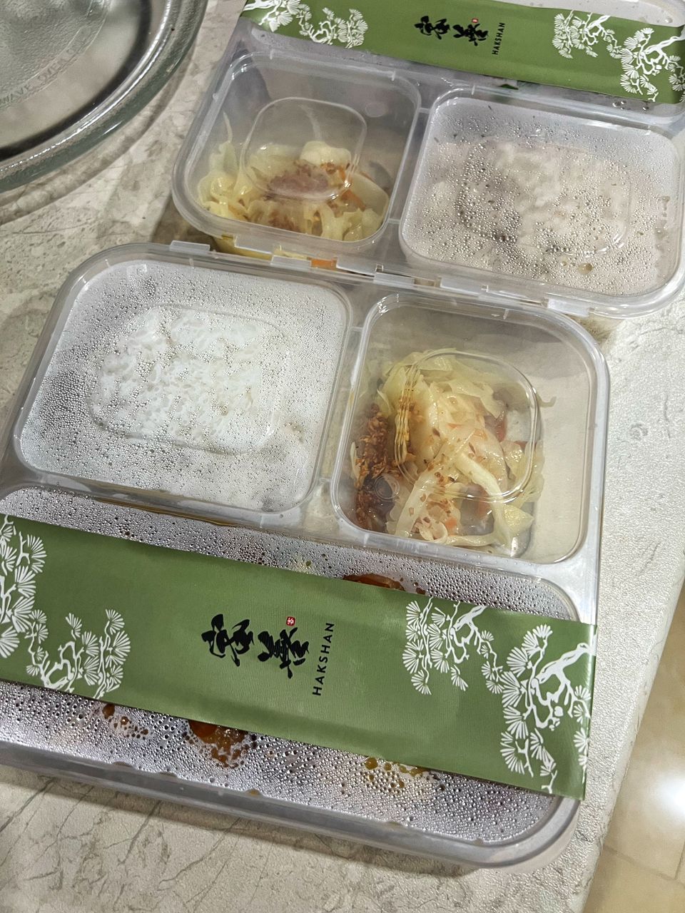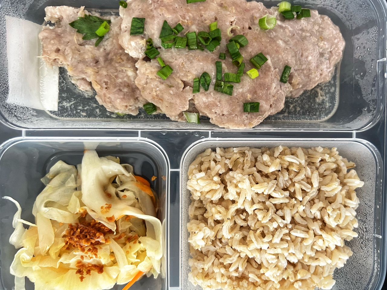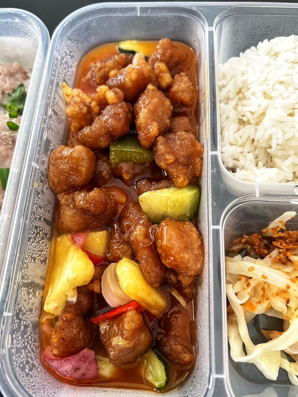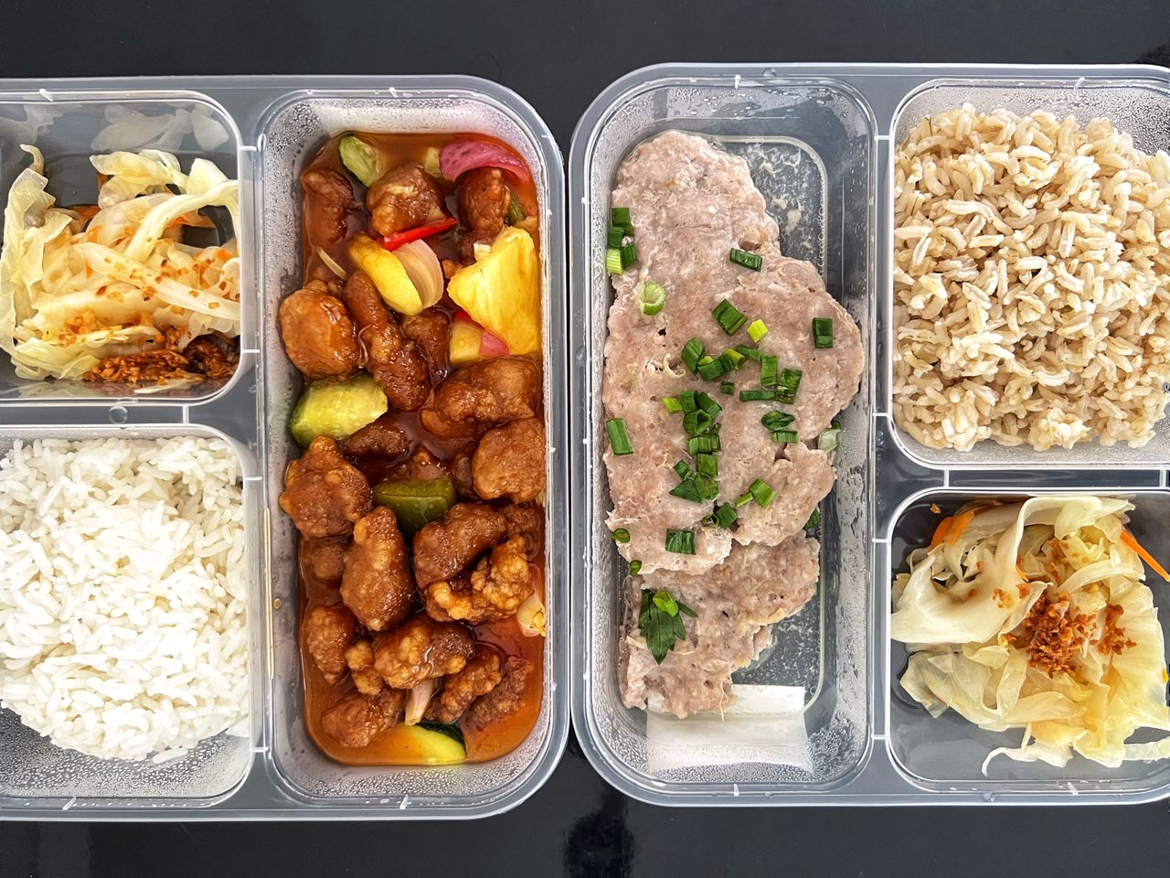 Delivered neatly in a compartmentalised tray, it came with two types of rice (white and brown), stir-fried cabbage with garlic oil, and the stars of the show: a steamed minced pork patty and sweet and sour pork.