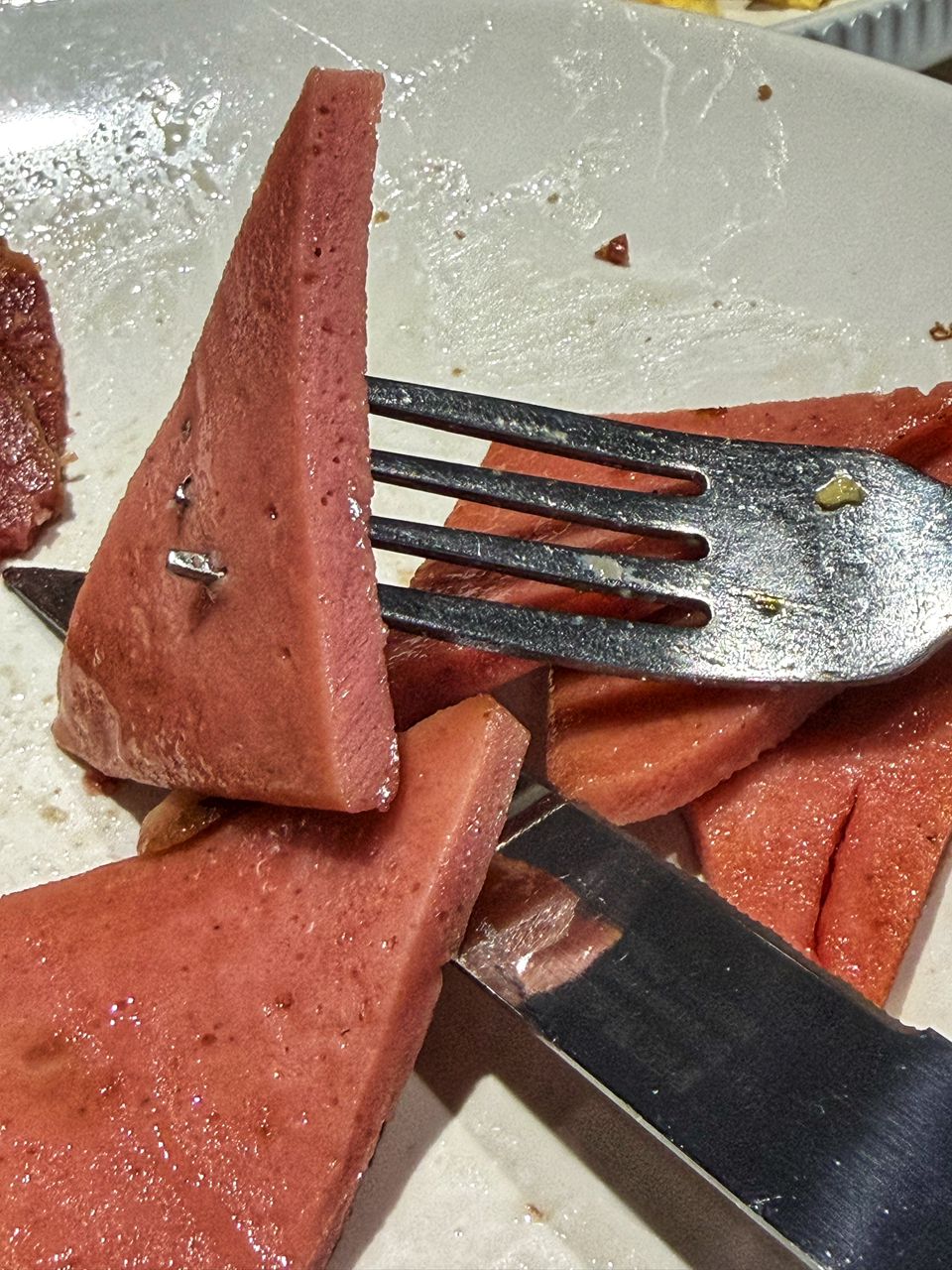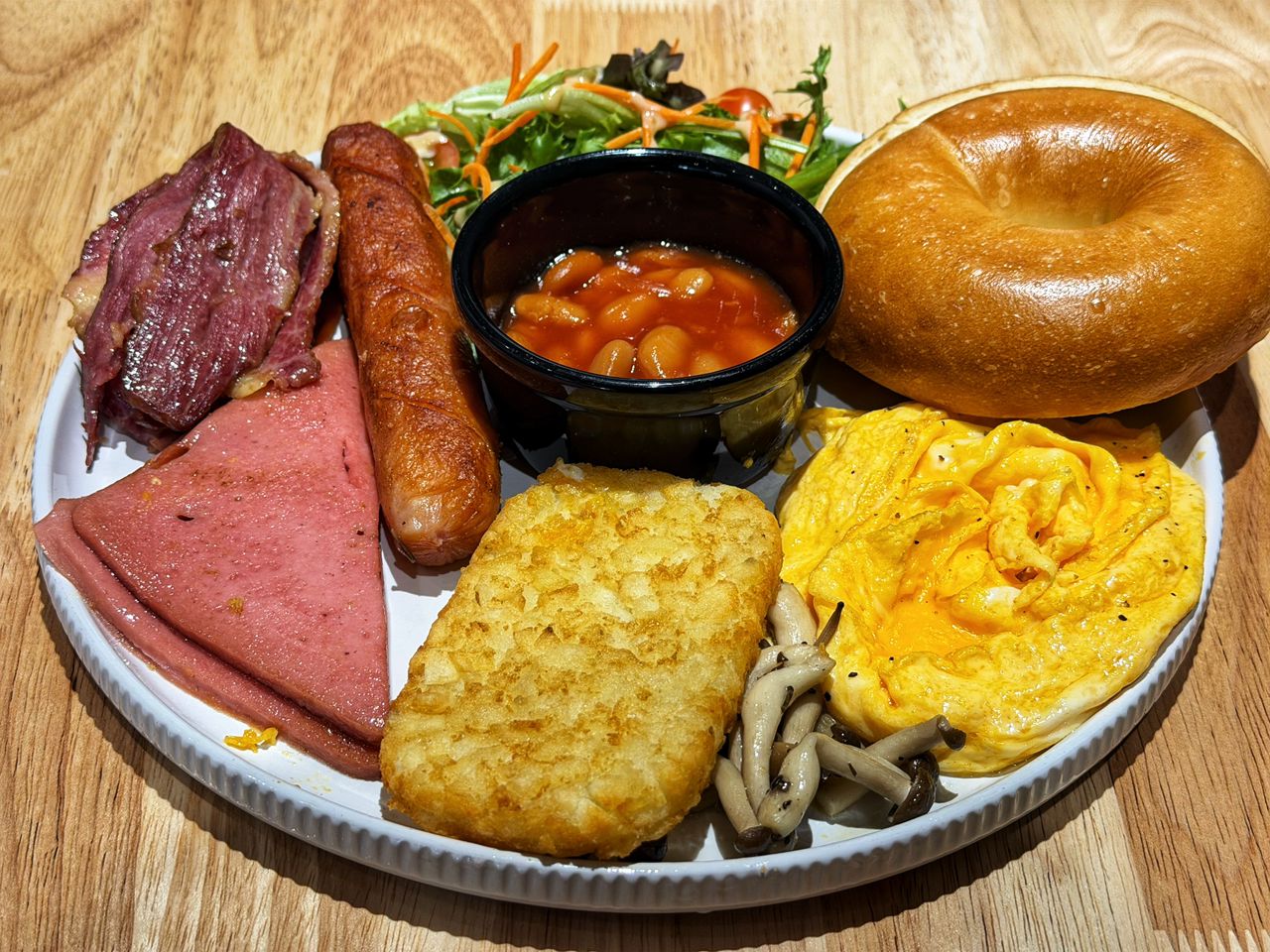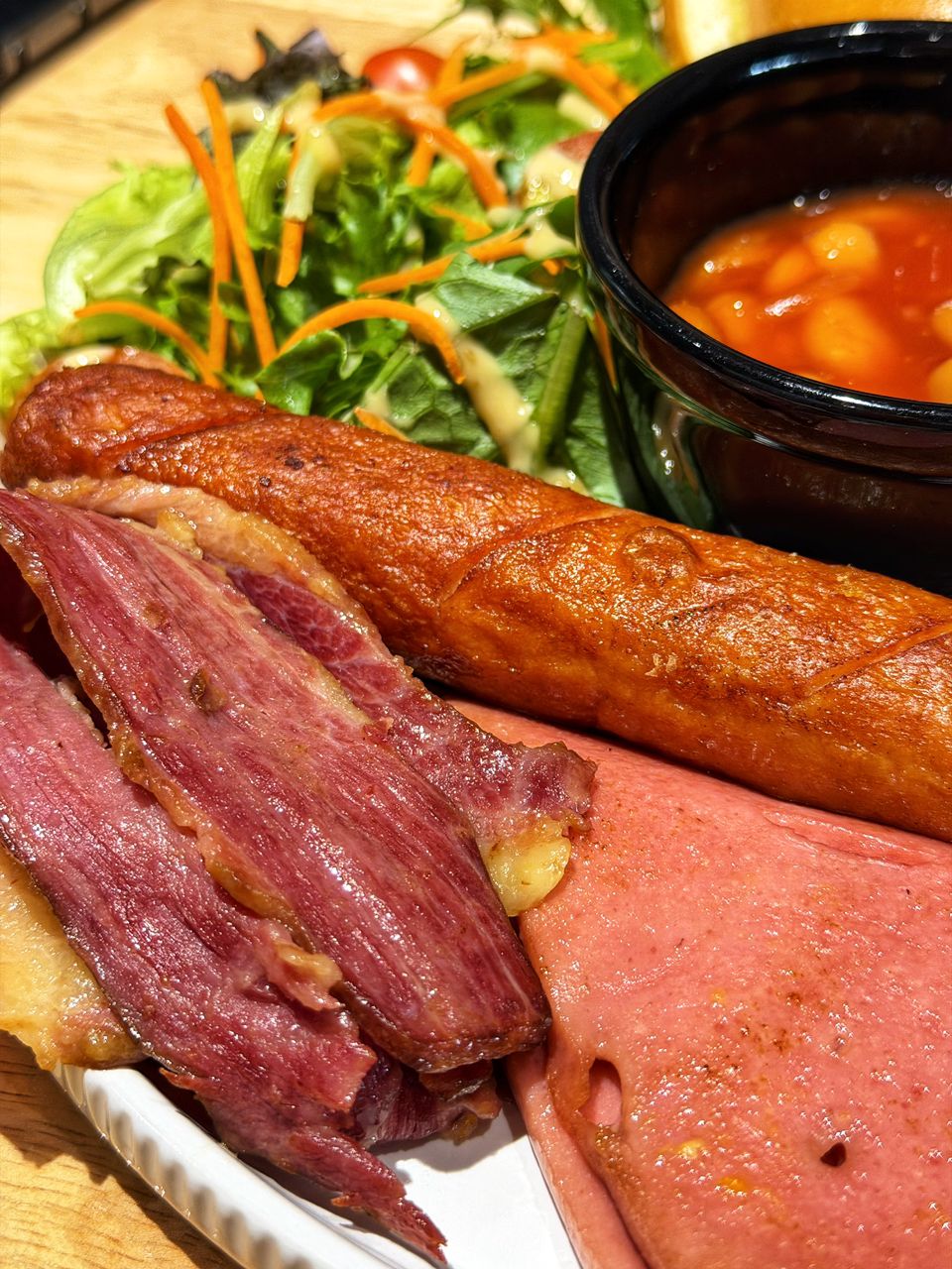 The serving included juicy sausage, plentiful beef bacon, and notably thick slices of chicken ham.