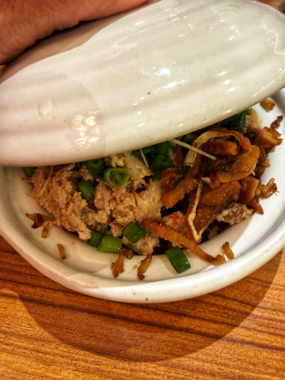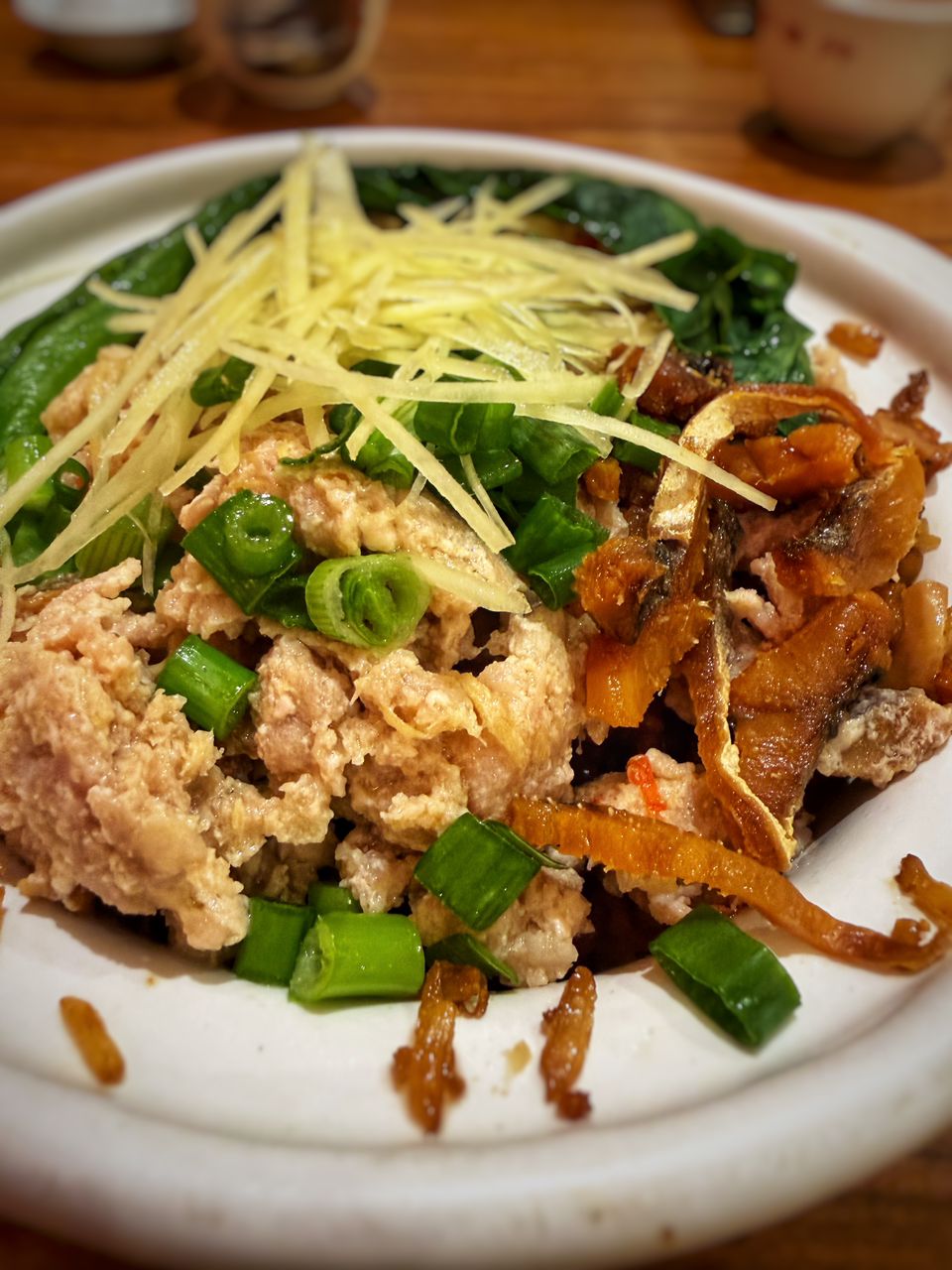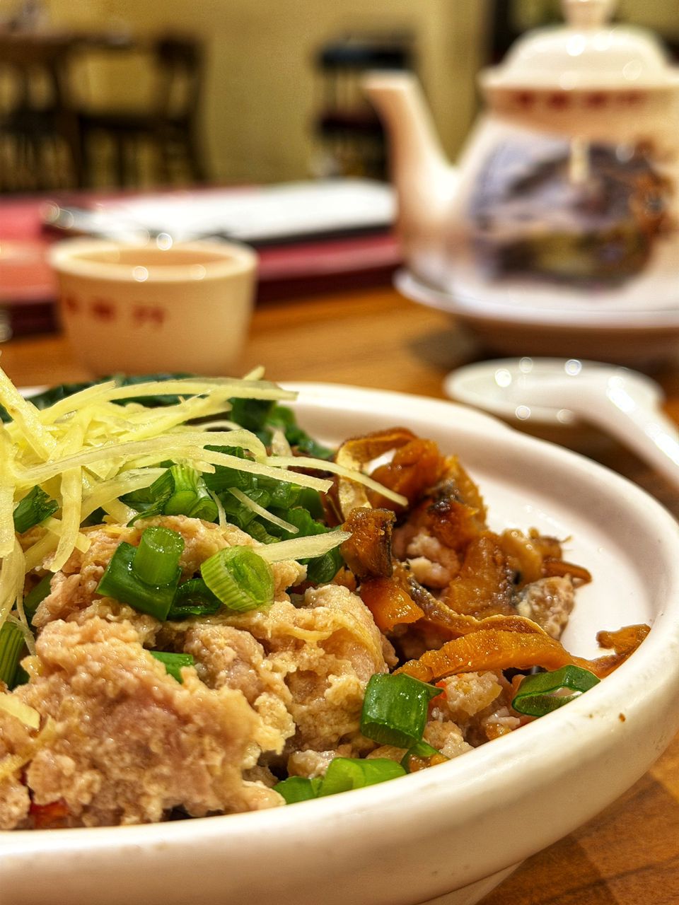 Generous minced pork and salted pork, fresh greens overlaid the yam rice.