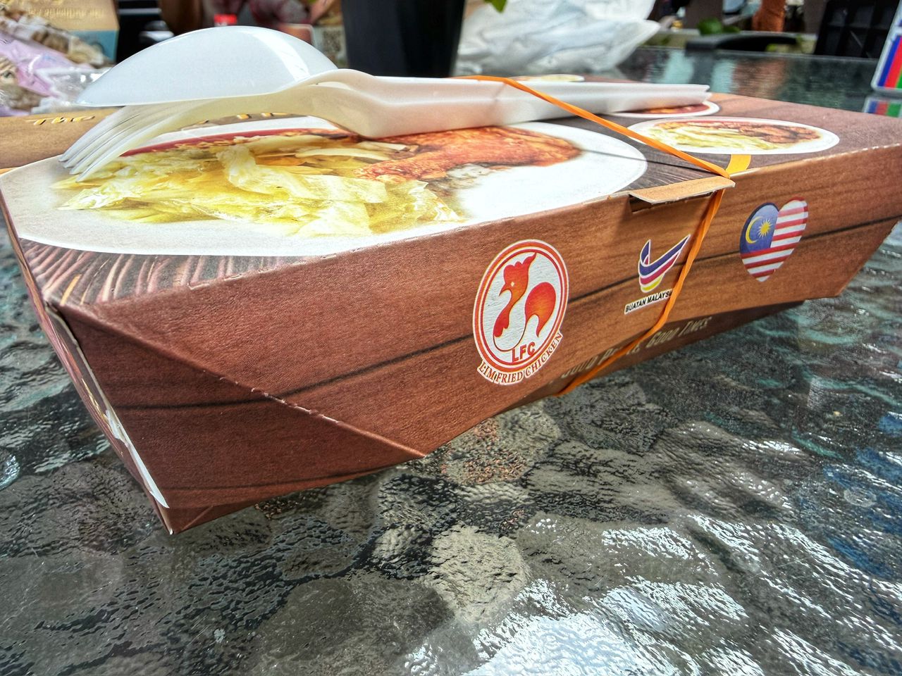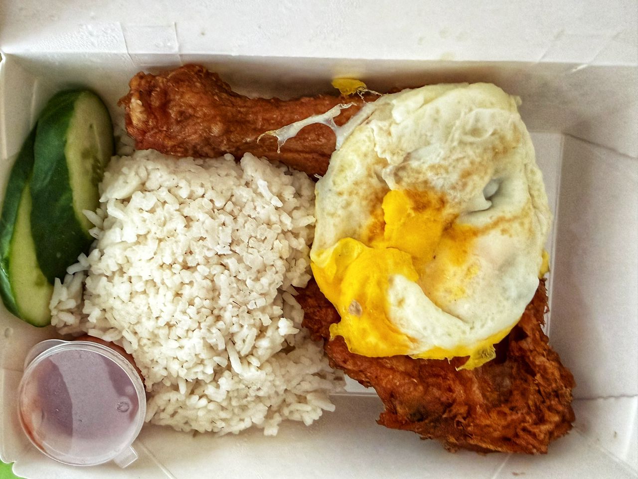 It arrived neatly packed — rice, fried egg, cucumber slices, sambal, and that familiar piece of golden-brown fried chicken.