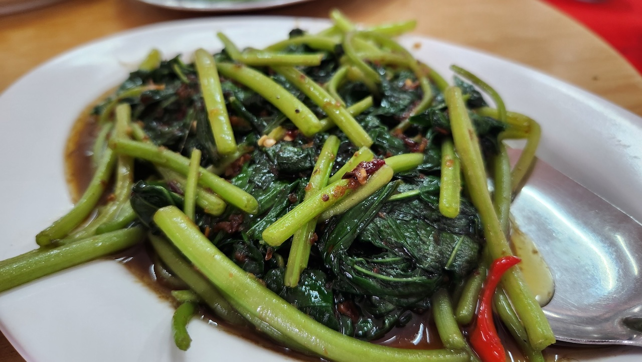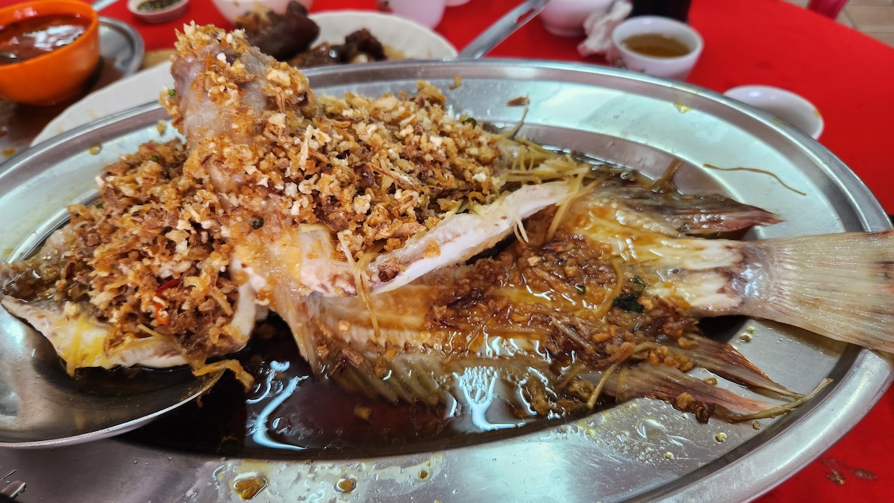 The other two dishes of Sweet Potato Leaves fried with chilies and steamed fish with “chai poh” was so so for me …but they were flavorful.