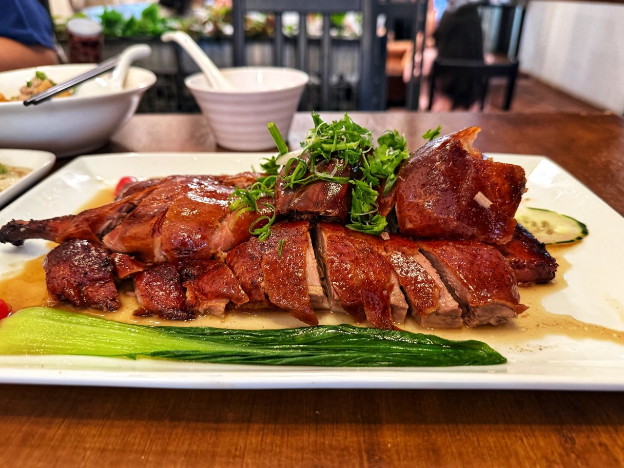 The duck arrived nicely chopped, with glossy skin and a pool of jus on the plate. The spread felt very “family lunch on a weekend” – roast, a vegetable, a claypot-style soup and noodles to fill up on.