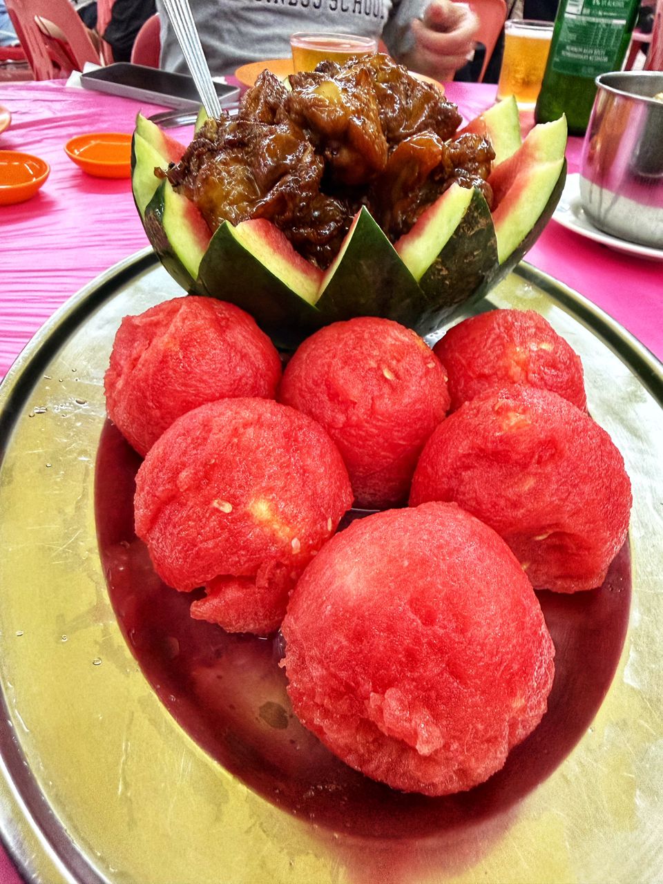 The only dish that truly stood out was the signature Champagne Chicken. The presentation is the immediate hook, served in a carved-out watermelon bowl. The chicken pieces themselves are sticky, sweet, and savoury, and the accompanying watermelon balls are a necessary palate cleanser that cuts through the richness.
