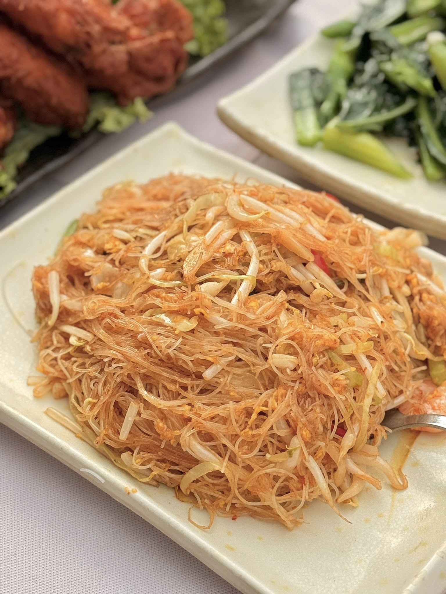 除了螃蟹,其他菜色也不马虎。虾酱炸鸡翅,酥脆多汁、虾酱味渗透到肉里,每一口都很过瘾;清炒芥兰保持清爽脆口,很好地平衡了整桌的重口味;还有一盘 星州炒面粉,这家的版本带有茄汁风味,酸酸甜甜特别开胃,也是我喜欢的做法。
