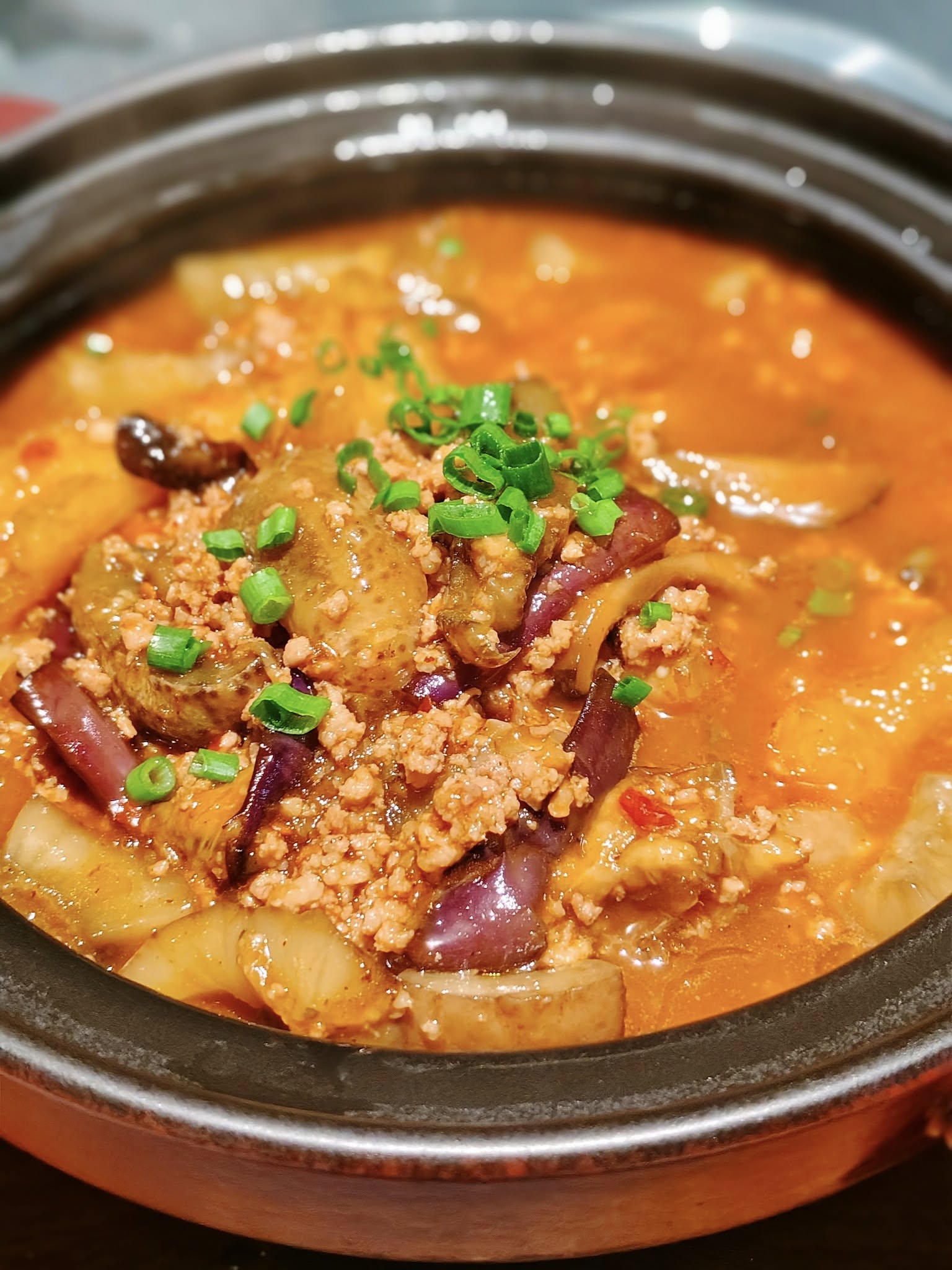 Sea Cucumber , Pork Tendon & Eggplant in Claypot.